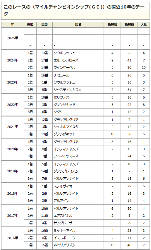 【マイルチャンピオンシップ(G1)の直近データ】過去の同レースの指数成績を見ていきましょう。
