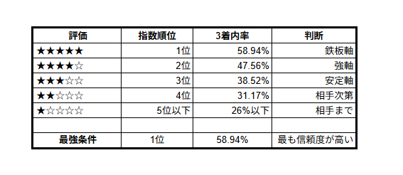 指数順位ごとの3位以内入着率です!